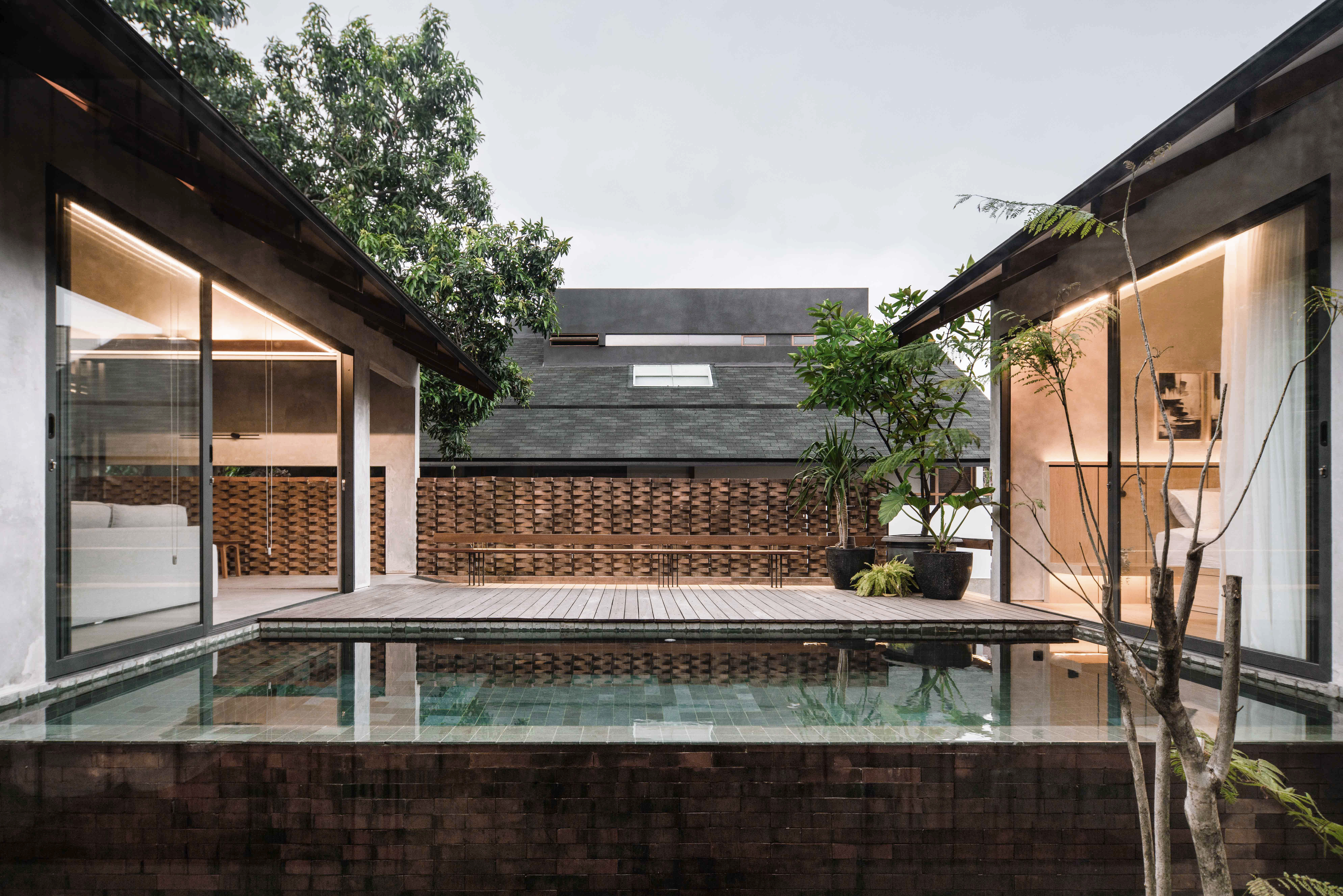 The front of the building faces south, with a touch of exposed red brick stacking at 45 degrees to create a rich texture. The use of a saddle roof on ACH House with a low impression maximizes openings without disturbing privacy. The orientation of the opening is maximized towards the north and south to avoid direct sunlight. Communal spaces are limited by wide openings, so it does not need artificial ventilation. The main material is dominated by exposed cement, red brick and the use of solid teak wood.