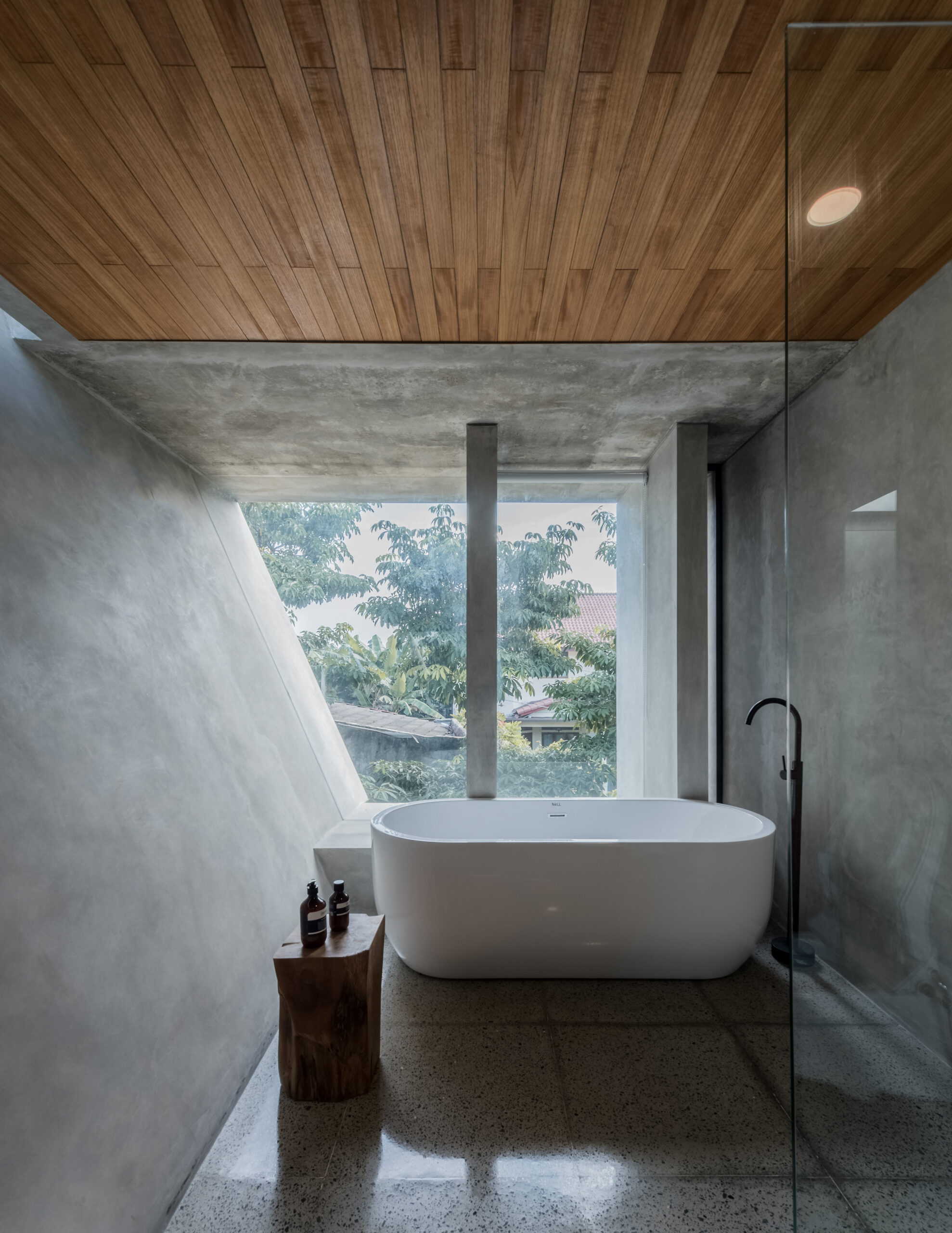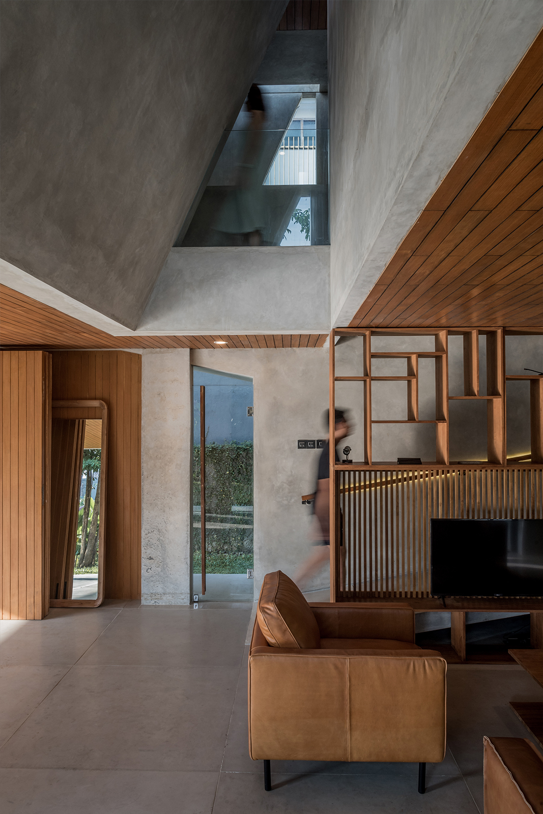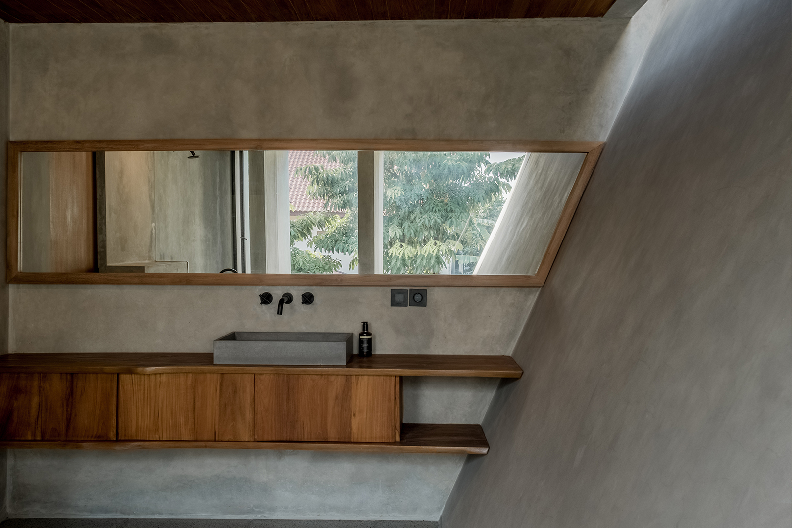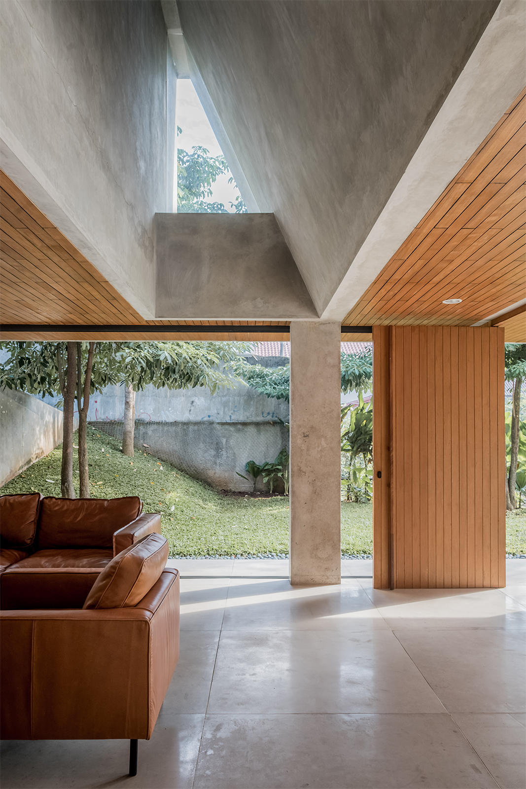 The circulation space utilizes natural ventilation and sunlight to create a tropical home concept. Maximize openings in every space with large windows for rooms facing the garden. And horizontal rips for circulation spaces, both on the walls and ceiling in the form of skylights. Each room has a view towards the garden with wide openings. The green space is designed linearly from front to back, continuously from the ground floor to the roof of the service rooms.