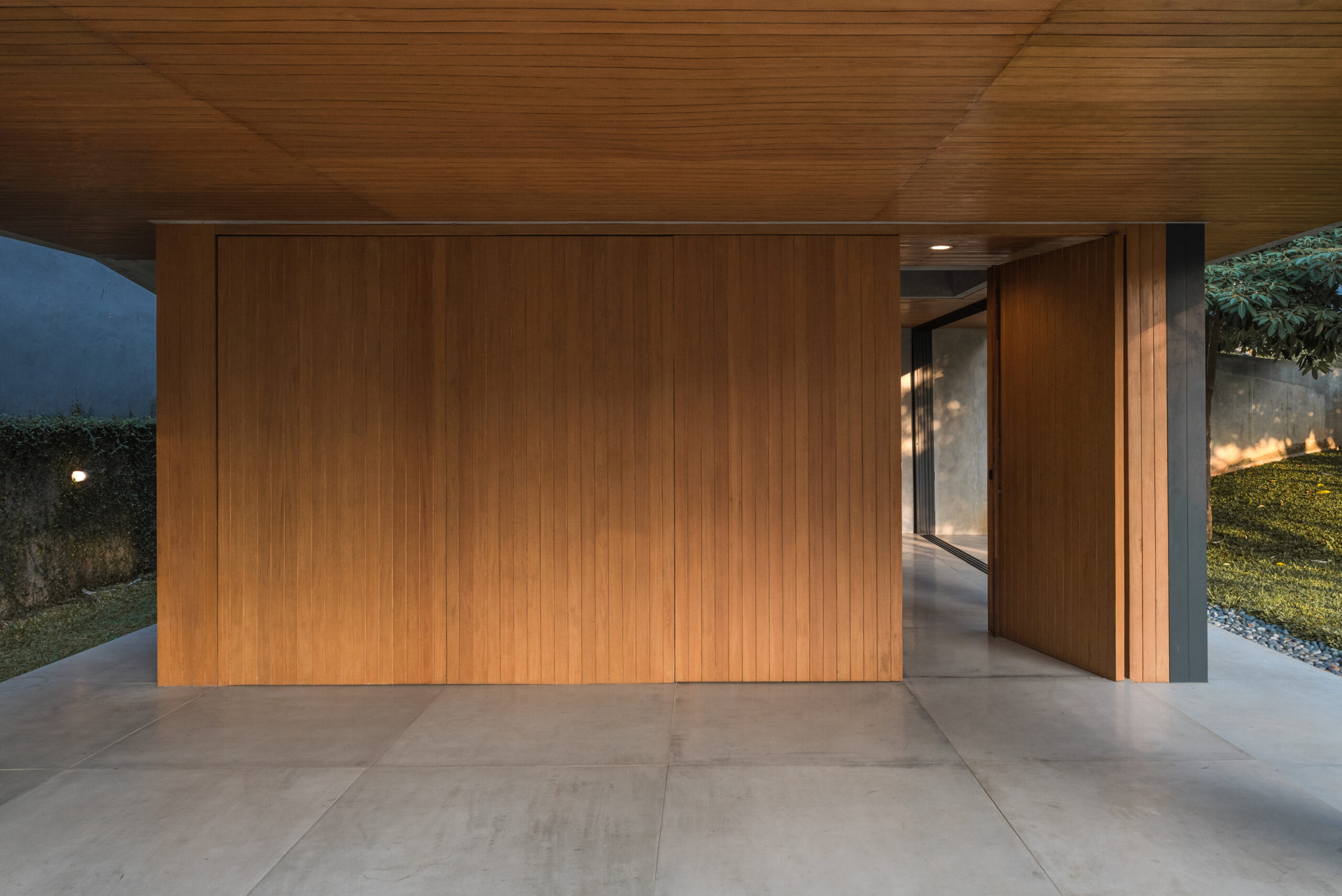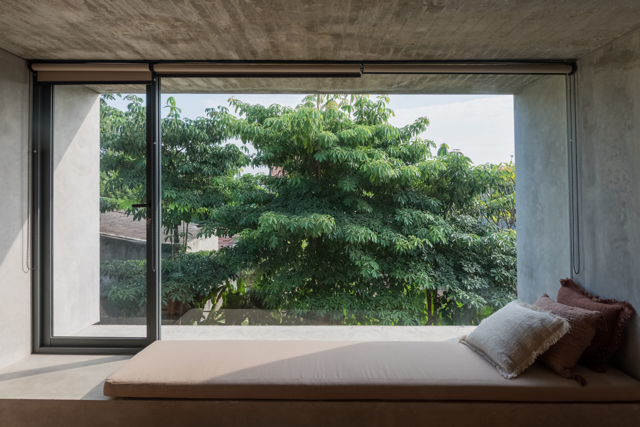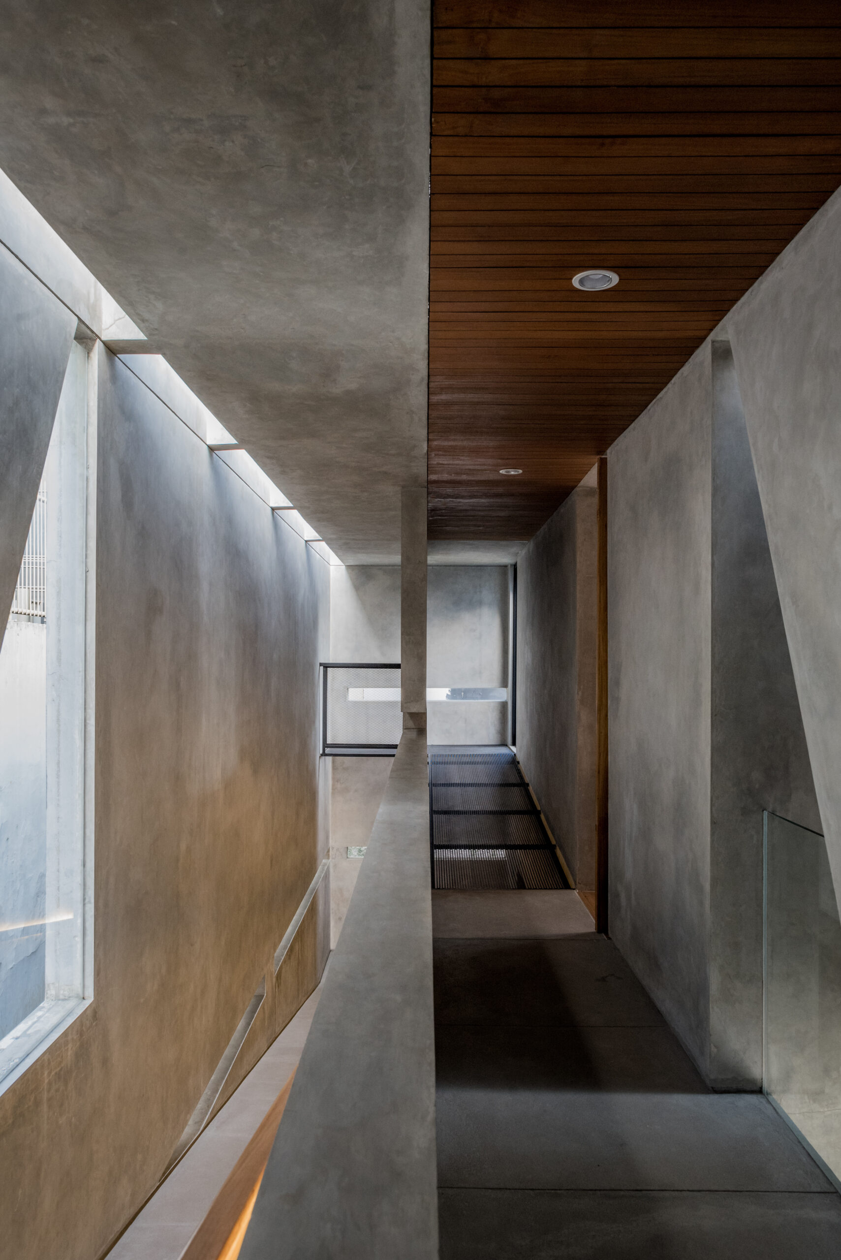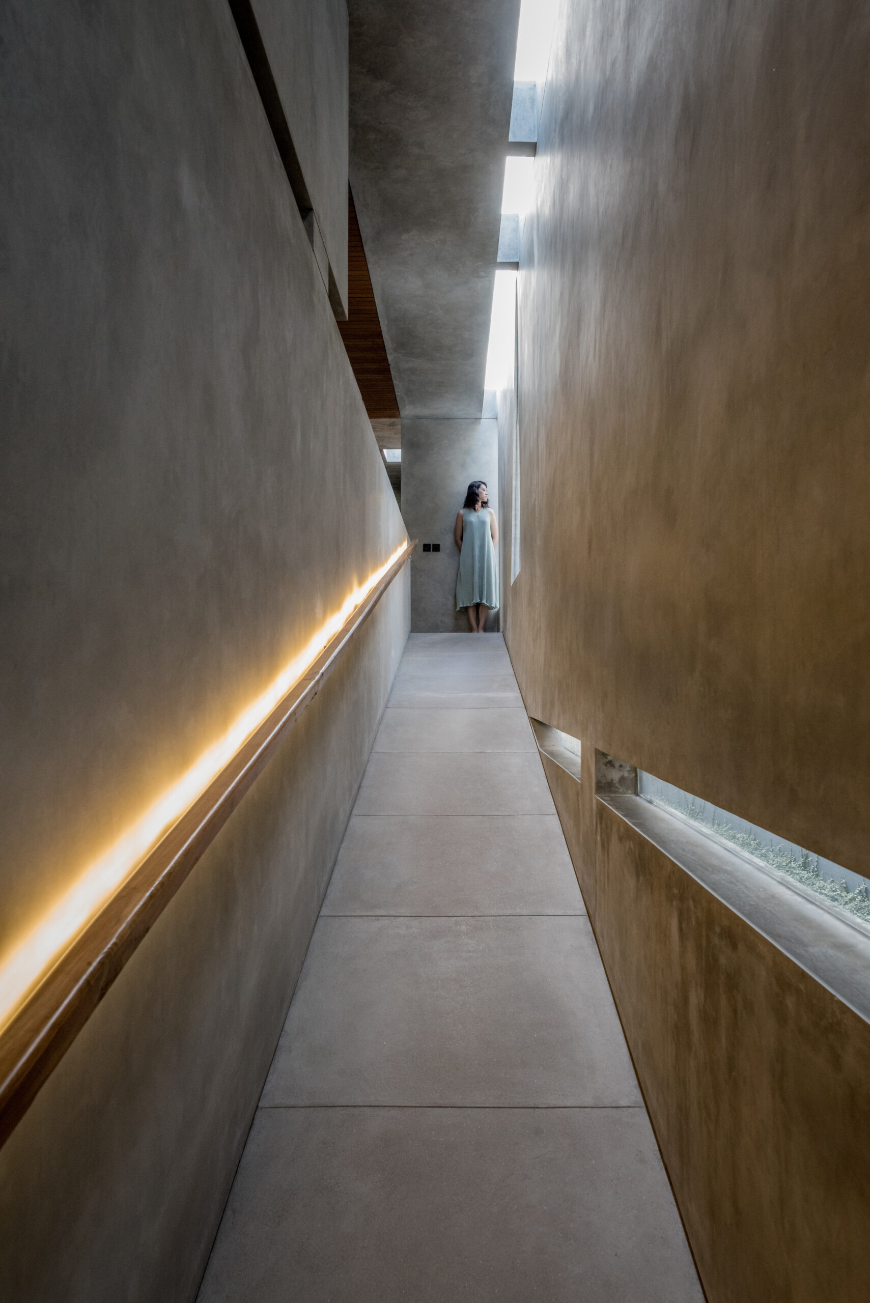 The circulation space utilizes natural ventilation and sunlight to create a tropical home concept. Maximize openings in every space with large windows for rooms facing the garden. And horizontal rips for circulation spaces, both on the walls and ceiling in the form of skylights. Each room has a view towards the garden with wide openings. The green space is designed linearly from front to back, continuously from the ground floor to the roof of the service rooms.