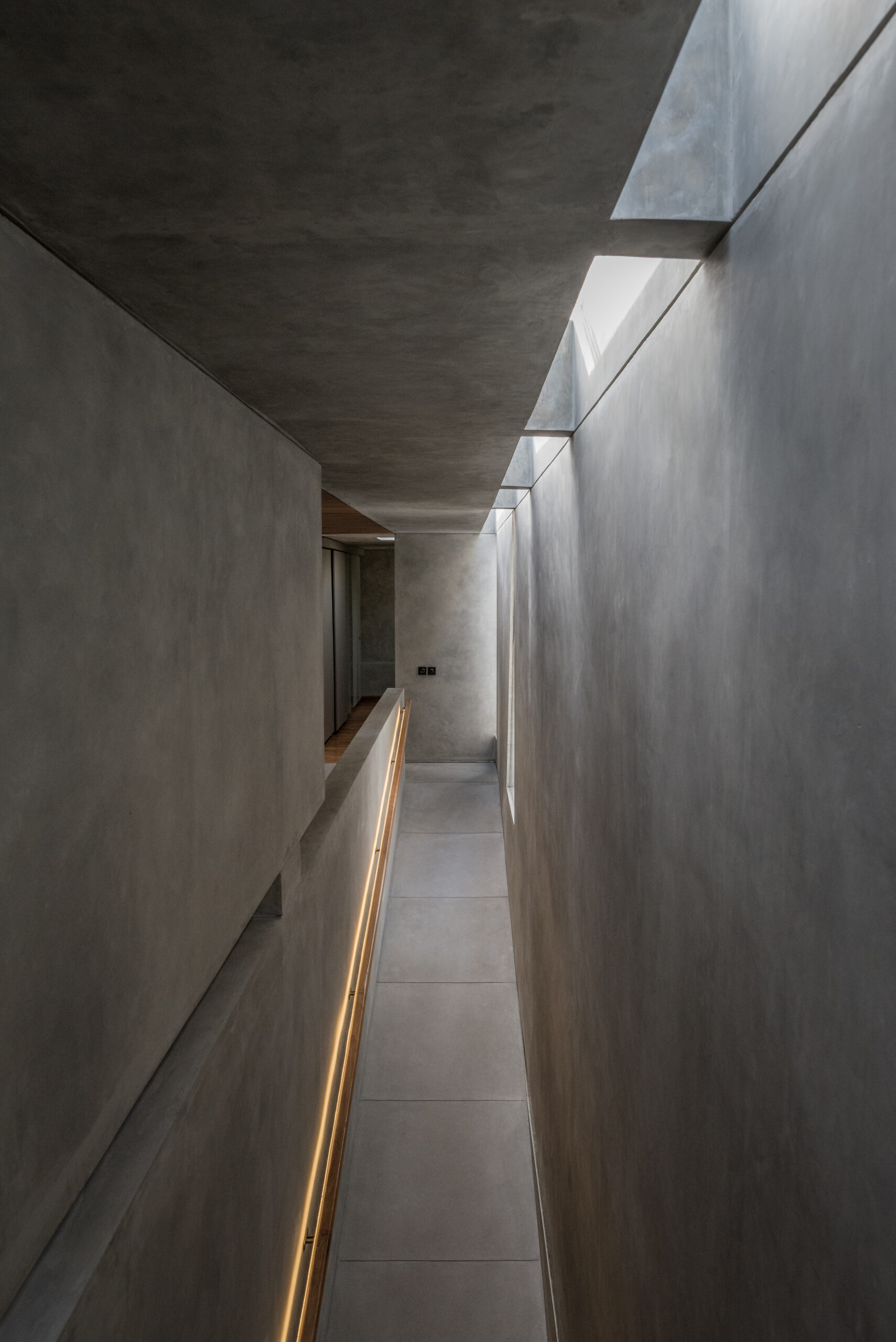 The first impression in the entrance area is made high and bright by the presence of a sharp continuous void covered with glass that lets light into the space. The sloping wall that is created gives a broad impression to the space that borders the void, the master bathroom. This affects the outer area, the sloping walls between the repetitions of the vertical walls create a visual contrast to the facade.