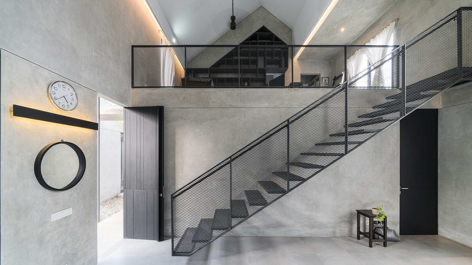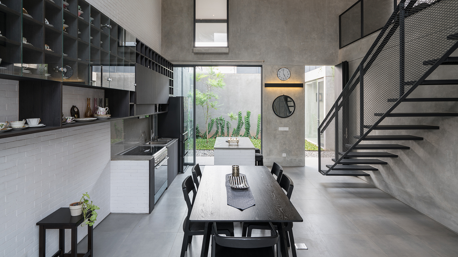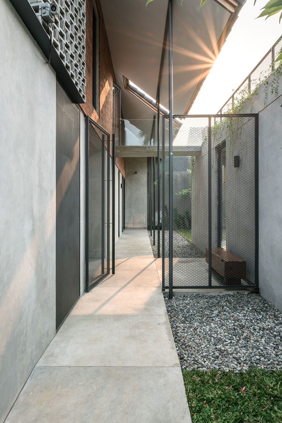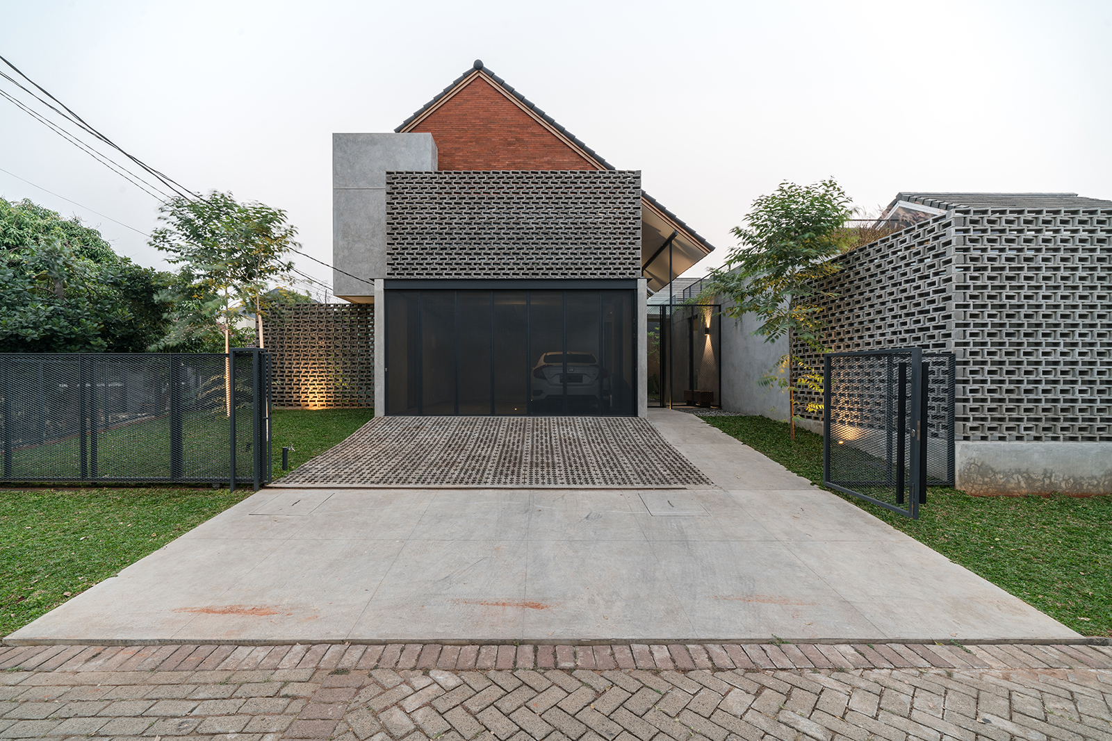 The main roof of the triangle as a symbol of tropical architectural forms. Honesty material is implemented in unfinished facade of raw cement and exposed terracotta brick. The owner wants a house with many openings without losing privacy so the openings are covered with a layer of roster walls. Each room has a garden or terrace view. Minimizing artificial disposition is pursued by applying a double height ceiling to the communal space. Expended metal stairs that float to give a light and transparent expression.