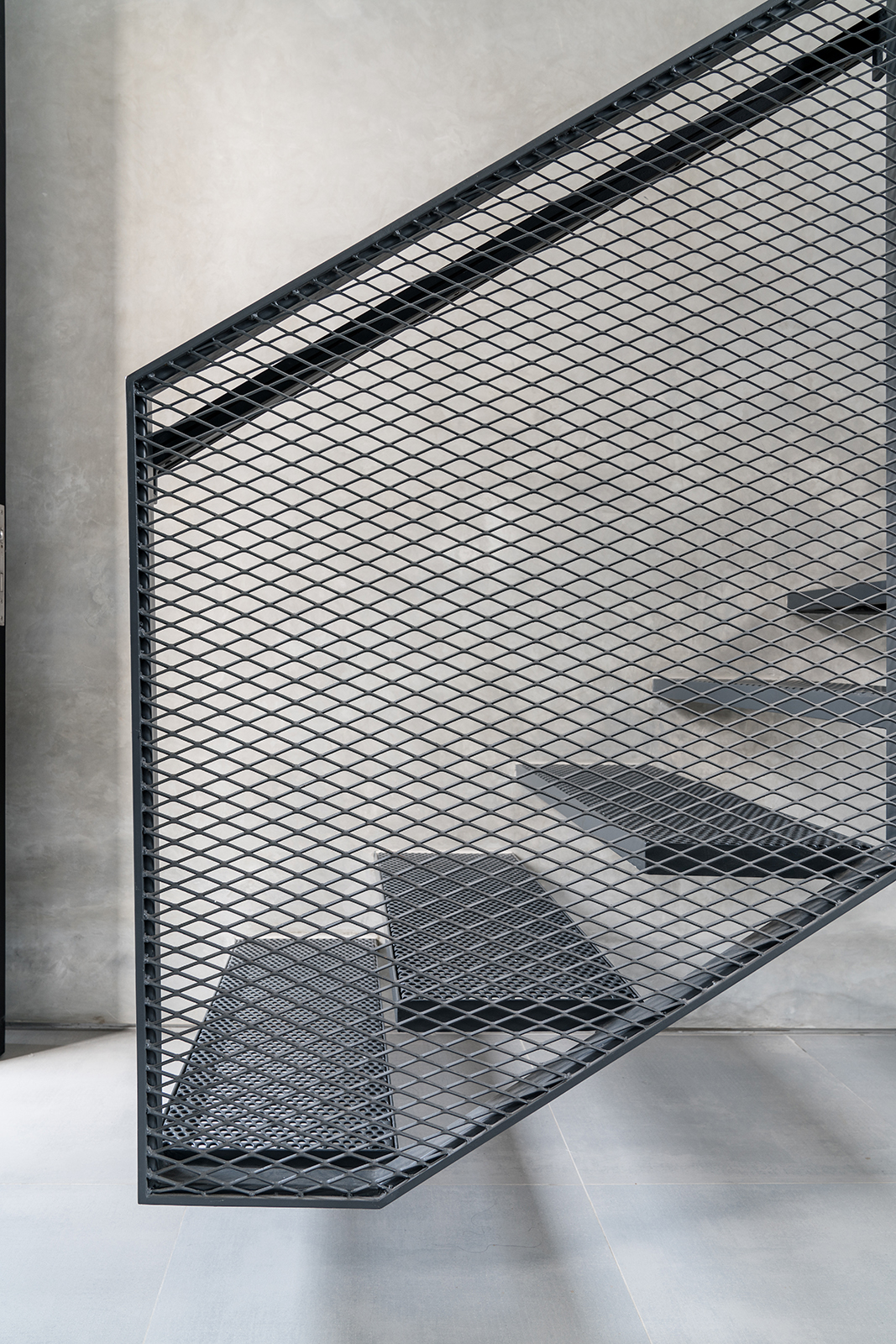 Rumah Rongga has the main visual with hollow material. The walls of the roster and perforated metal give the impression of a transparent space boundary. The selection of perforated material aims to provide a gap for light and air into the building. Sunlight entering the building in the morning will form a patterned shadow due to an orientation facing east.