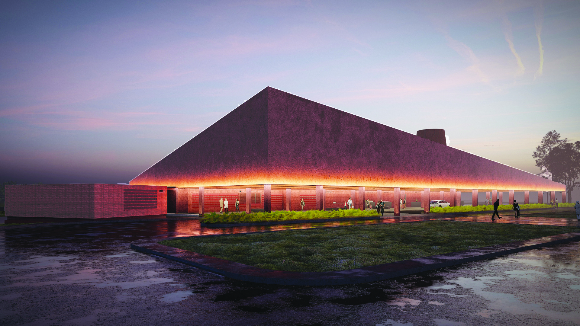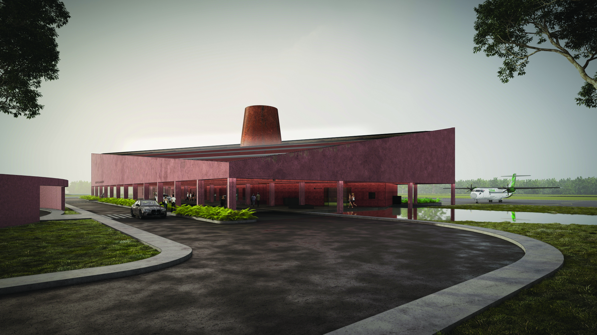 The shape and details of the layered and spaced airport roof are inspired by elements of local wisdom on the roofs of Baduy tribe houses that looks like they are piled up because of the difference in contour height. Details of the distance between the roof piles, which are quite large, serves to flow natural air circulation vertically throughout the room. Another idea is a porous wall detail, which helps horizontal air circulation. The conical funnel design serves to let light into the arrival area. Pools around the building helps keep the air temperature inside the airport cool and calm.